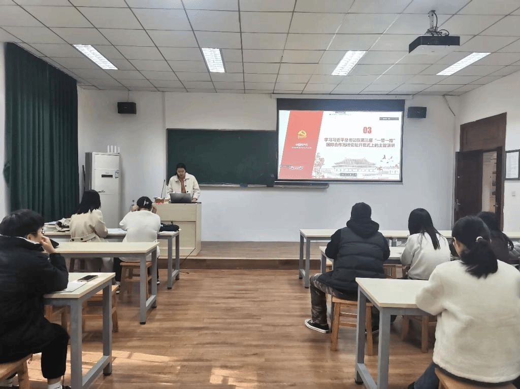 随后,谢满玉同志领学了习近平总书记致欧美同学会成立 110 周年的贺信精神和习近平总书记在第三届“一带一路”国际合作高峰论坛开幕式上的主旨演讲。谢满玉同志带领大家回顾了共建“一带一路“过去10年取得的辉煌成绩,讲述了我国支持高质量共建”一带一路“的八项行动。