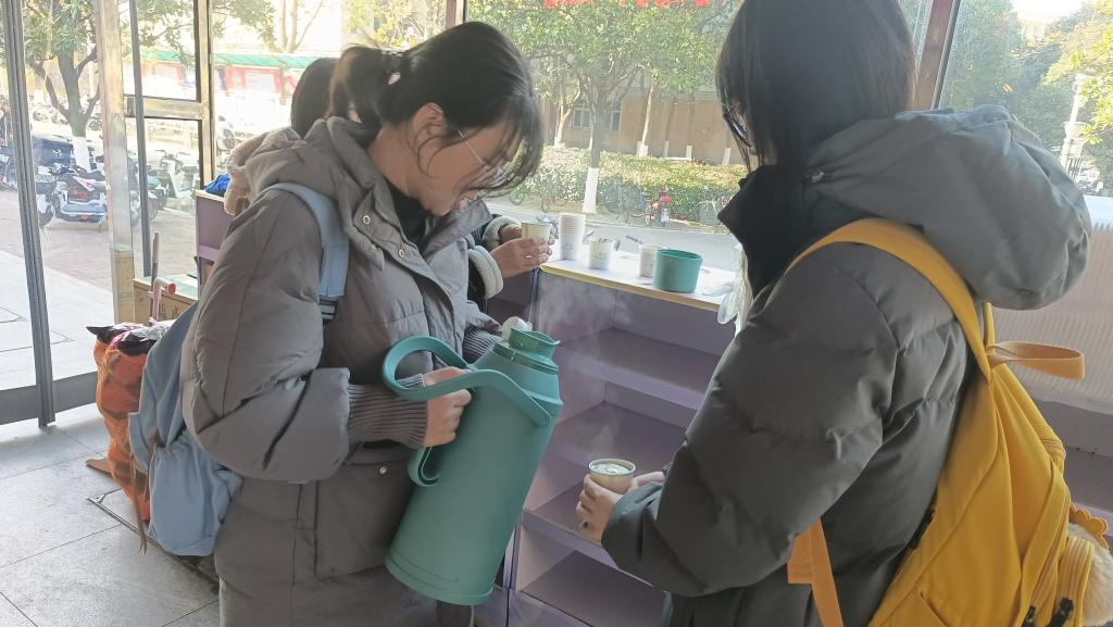随后,同学们按照分组领取活动材料后,有序前往食堂、超市等指定地点开始了送茶送暖行动。志愿者同学聚在空闲的桌前,给每一个茶杯添上茶叶,热水缓缓从壶中倾泻而出,茶叶在水中翻滚,一股沁人心脾的茶香随着热气冒出。热茶制作完成,同学们一杯接一杯端给工作人员。在同学们表明来意后,叔叔阿姨露出惊喜的笑容,志愿者小心提醒着“你们辛苦了,茶是刚刚泡的,小心烫伤”,阿姨小心接过冒着热气的茶杯“谢谢同学们,你们有心了哟”。在工作不繁忙的时间段,他们端着茶杯聚在一起休息聊天,气氛平和美好。志愿者的一杯暖茶让他们繁忙的工作之余能有机会静下心来,感受茶的清香和片刻的宁静。