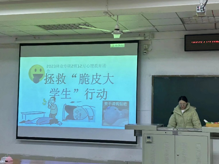 12月6日晚,澳门十大网投正规官网平台2023级林业专硕2班开展了入学以来的第一次主题心理班会。本次班会主题为“拯救‘脆皮大学生’行动”,以网络热梗“脆皮大学生”一词为切入点,试图以幽默风趣的语言表达、案例分析来提升大家关注自己身心健康的意识。
