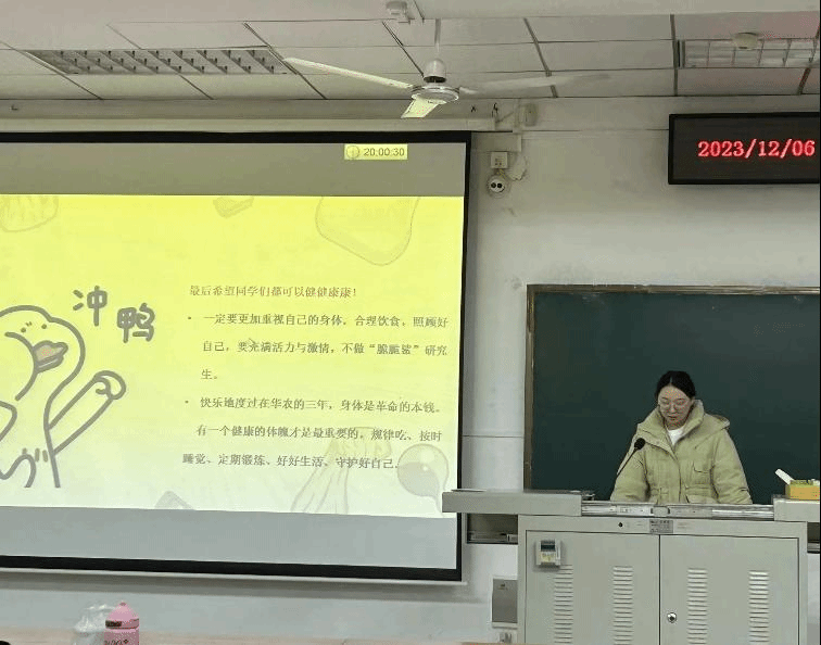 最后,心理委员刘跃进行班会总结,并提醒同学们一定要更加重视自己的身体,合理饮食,照顾好自己,要充满活力与激情,不做“脆脆鲨”研究生。要有一个健康的体魄,规律吃、按时睡觉、定期锻炼、好好生活、保护好自己,快乐地度过在华农的三年!