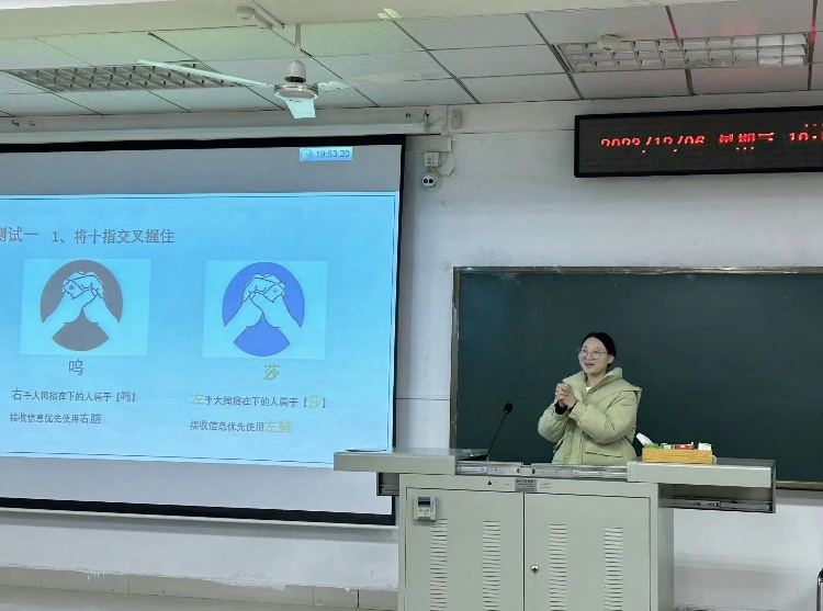 班会进行时,班级心理委员刘跃对本次班会流程进行了简单介绍,引出了本次心理班会的主题与主旨。为了活跃班会气氛,班级首先开展的是一项热门的隐藏性格测试(USA测试),心理委员先向大家介绍了相关规则,再发出指令:“将十指交叉握住”“双手在胸前交叉抱住”,最后展示出不同搭配的性格分析文字供同学们参考。会议结束时,这个有趣的测试也得到了班级同学的一致好评。
