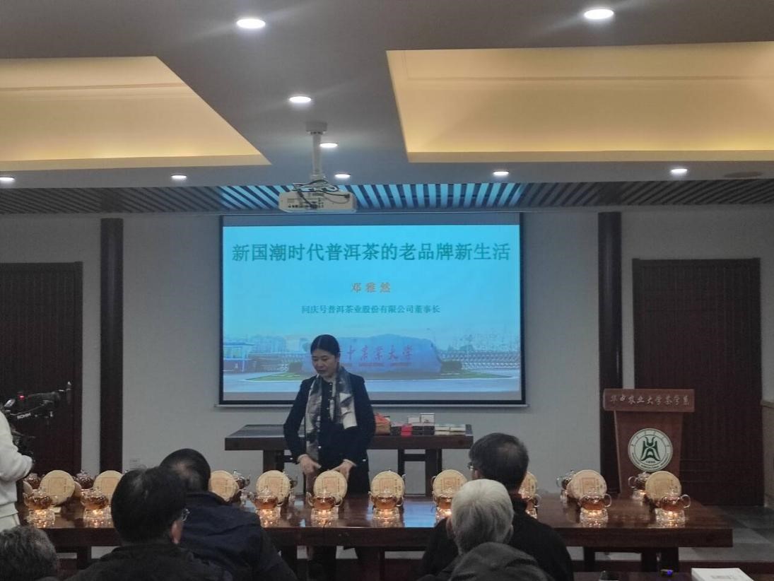 11月12日,澳门十大网投正规官网平台“新国潮时代普洱茶的老品牌新生活”交流会在园林北楼226耕读茶室顺利开展。本次活动邀请了西双版纳同庆号普洱茶业股份有限公司董事长邓雅然。她将以自己的亲身经历讲述与普洱茶结下的深厚情缘,让同学们了解普洱茶的真实发展现状。在新国潮背景下,是如何将普洱茶老品牌融入当代年轻人的生活方式。