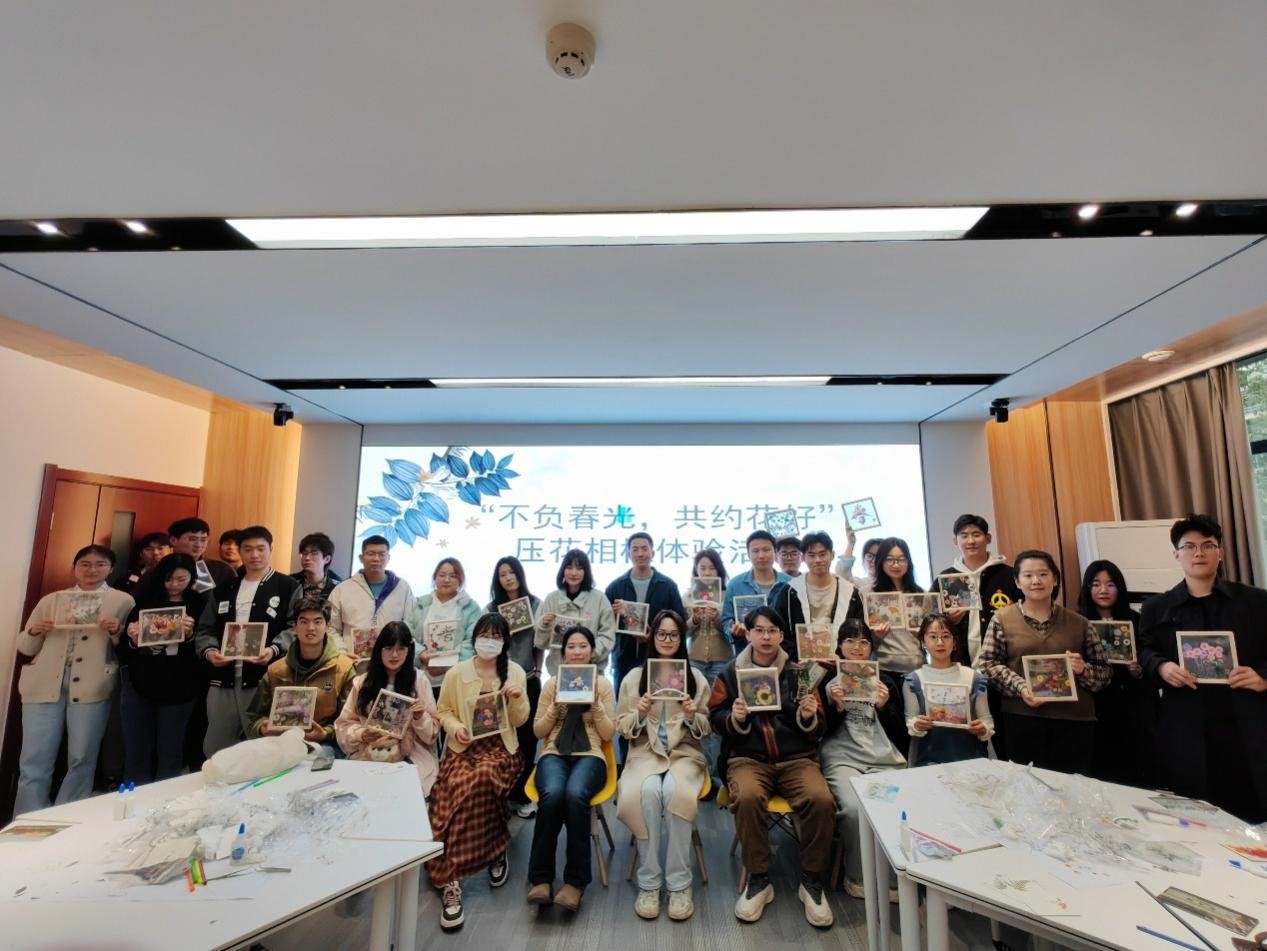 欣赏完各式各样精美的压花作品后,各位同学开始动手挑选压花材料。大家纷纷根据自己脑中的构图将花朵和花瓣精心布置在相框板上,同时与搭档交流色彩搭配方式,探讨不同花材的摆放与整体构图,尝试创造出美观和富有层次感的图案。伴随着同学们的欢声笑语,一幅幅色彩斑斓、别具一格的植物图案跃然框内。活动最后,小组成员互赠压花作品,各位同学相聚一起,分享创作感受,大家在欢快声中合影留念。