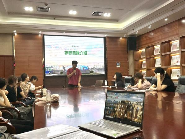 班会伊始,班委协同组织班级同学模拟应聘的场景,辅导员肖晗老师对每位同学的表现进行了点评。