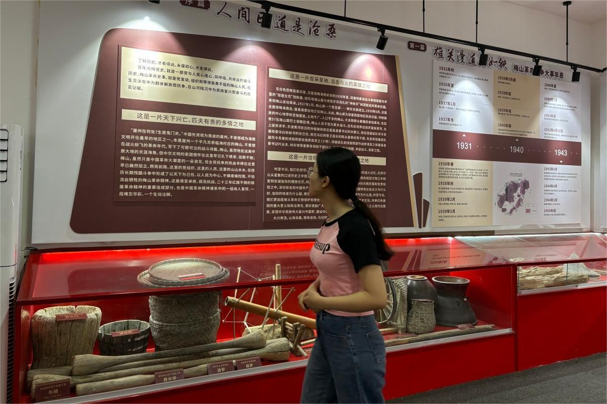 展馆内设有“梅山革命斗争大事录”“光辉的战斗历程”、“功垂千秋”、“发扬革命传统”和“领导的关怀前辈的希望”5大部分。工作人员为他们解释着曾经的艰难险阻:“面对敌人的烧、杀、抢,他们毫不畏惧、奋勇杀敌。”梅山革命史事,就是党发动、组织和带领英勇不屈的梅山人民,在生灵涂炭中为翻身解放而抗争、在山河陆沉中为民族复兴而奋斗的忠实记载。