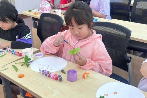 在一系列科普知识学习后,通过图片讲解与视频观看,小朋友们掌握了拓印画的制作方法。志愿者将提前采购的玉米、地瓜、生菜、秋葵等蔬菜切段、切片处理,同颜料画笔一同发给小朋友们,鼓励小朋友发挥想象力,大胆创作。随着时间流逝,雪白的画纸变得五彩斑斓,翠绿橙红的蔬菜掩去了原本的模样。瞧,秋葵像不像五角星,青菜茎像不像玫瑰花?看,地瓜和胡萝卜能印出瓣瓣西瓜,薄荷叶的纹路多么清晰!志愿者们根据小朋友的需求及时提供用尽的颜料、想要的蔬菜,最大程度地满足小朋友们的创作想象。