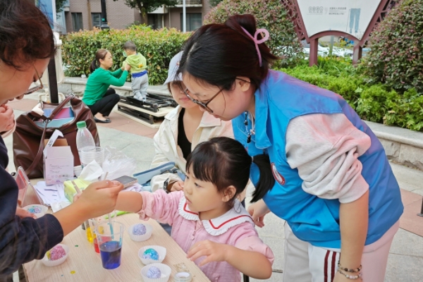 伴着深秋的阵阵清风,张瑜服务队的志愿者们早早来到活动摊位为活动顺利开展进行准备。他们将带来的废旧纸张撕碎、浸泡、打浆,并将食用色素调配至合适浓度,准备期间引来不少居民的好奇询问。活动正式开始,面对小朋友们充满探究而又跃跃欲试的目光,志愿者们热情邀请,耐心带领小朋友一步步完成“地球种子”的制作。将泡软的纸浆捞起,用力挤出水分并揉成球形,接着在纸浆团中小心放入少量蔬菜种子,最后根据自己的喜好给灰白的废纸赋予五彩斑斓的绚丽色调,一颗地球种子的制作便完成了。随着活动的顺利开展,越来越多的小朋友聚集而来,纷纷表示要制作自己的小地球。亦有部分家长在了解到本次志愿活动的主旨后,鼓励孩子积极参与,并对活动表达出认可与赞许。