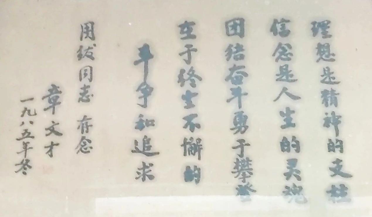 1985年冬章先生为周绂题字:“理想是精神的支柱,信念是人生的灵魂,团结奋斗勇于攀登,在于终生不懈的斗争和追求。”