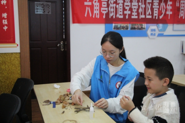 【核心提示】11月3日上午,十大网投正规官网张瑜服务队赴硚口学堂社区开展以“秋枝挽风,星叶缤纷”为主题的自然科普活动,旨在缓解社区儿童潜在的“自然缺失症”,通过制作树枝五角星亲近大自然。