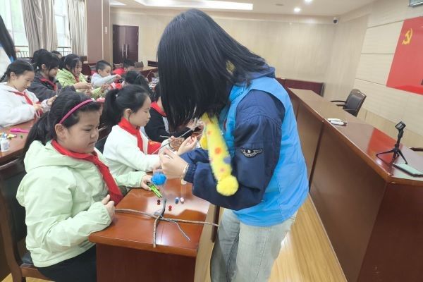 随后进入手工制作环节。志愿者们分发事先修剪好的树枝、色彩缤纷的毛线、胶水和儿童剪刀等材料,并详细演示了毛线曼陀罗的制作方法。小朋友们在志愿者的指导下,认真挑选毛线颜色,细心缠绕在树枝上,一个个色彩斑斓的毛线曼陀罗逐渐成形。在制作过程中,小朋友们在志愿者们的鼓励下充分发挥想象力,创作出各式各样的曼陀罗。每一个作品都携带着他们的欢声笑语与细腻情感,同时希望这件作品可以帮助同学们探索自我、感受自我,在自己的世界里遨游。