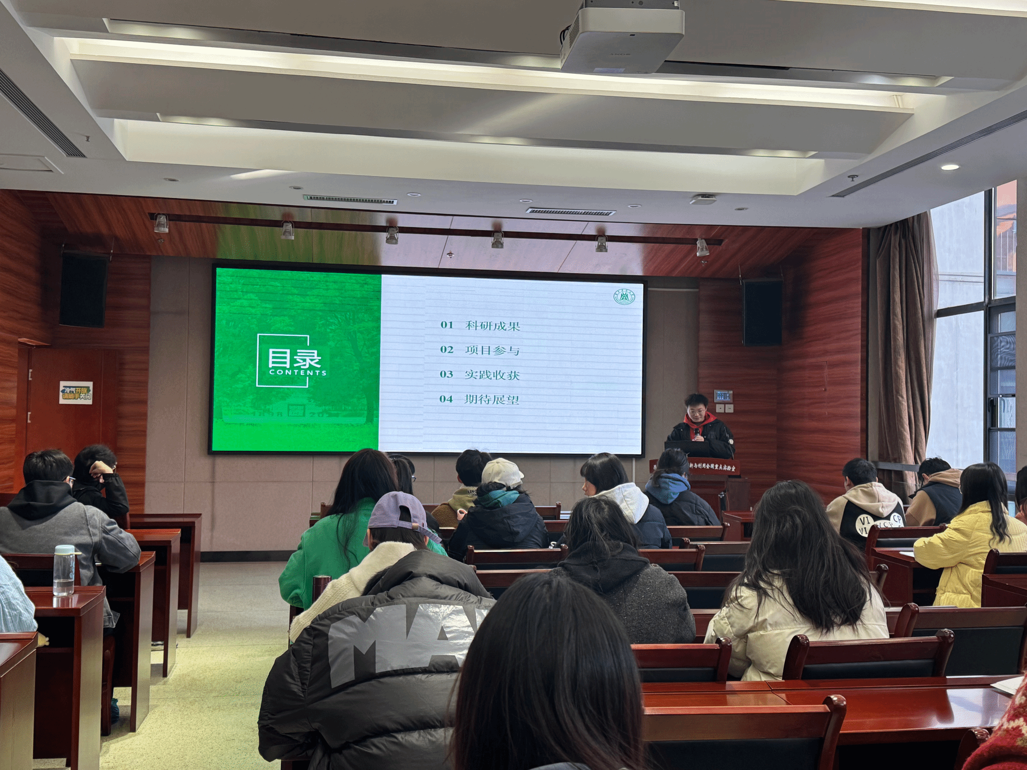 随后,李达岁从“个人情况”、“学术研究”、“文体实践”以及“未来发展”进行了自己获得国家奖学金的经历和经验介绍。首先他对自己的基本情况、个人成绩、班级职务等方面进行简单的介绍,他特别讲到,自己花了大量的时间在英语的学习上,九百八十多天,累积背诵两万多个词汇,在后面的科研、论文方面也对他自己有很大的帮助。然后他向大家讲述了自己三篇一作科研论文和一篇三作科研论文的大致研究内容和自己写论文的任务时间安排过程。最后,他将自己在文体方面获得的成就进行了展示,从多次被南湖新闻网、园林团学等媒体报道,到拿到百优运动健将,拿下多届运动会单项目冠军,甚至在许多志愿活动中也留下了他的身影,他呼吁大家一定要劳逸结合,科研、文体两手抓,拥有强健的体魄才能更有精力干好科研。