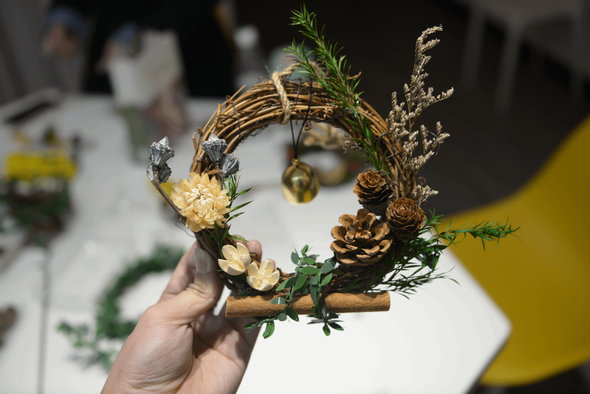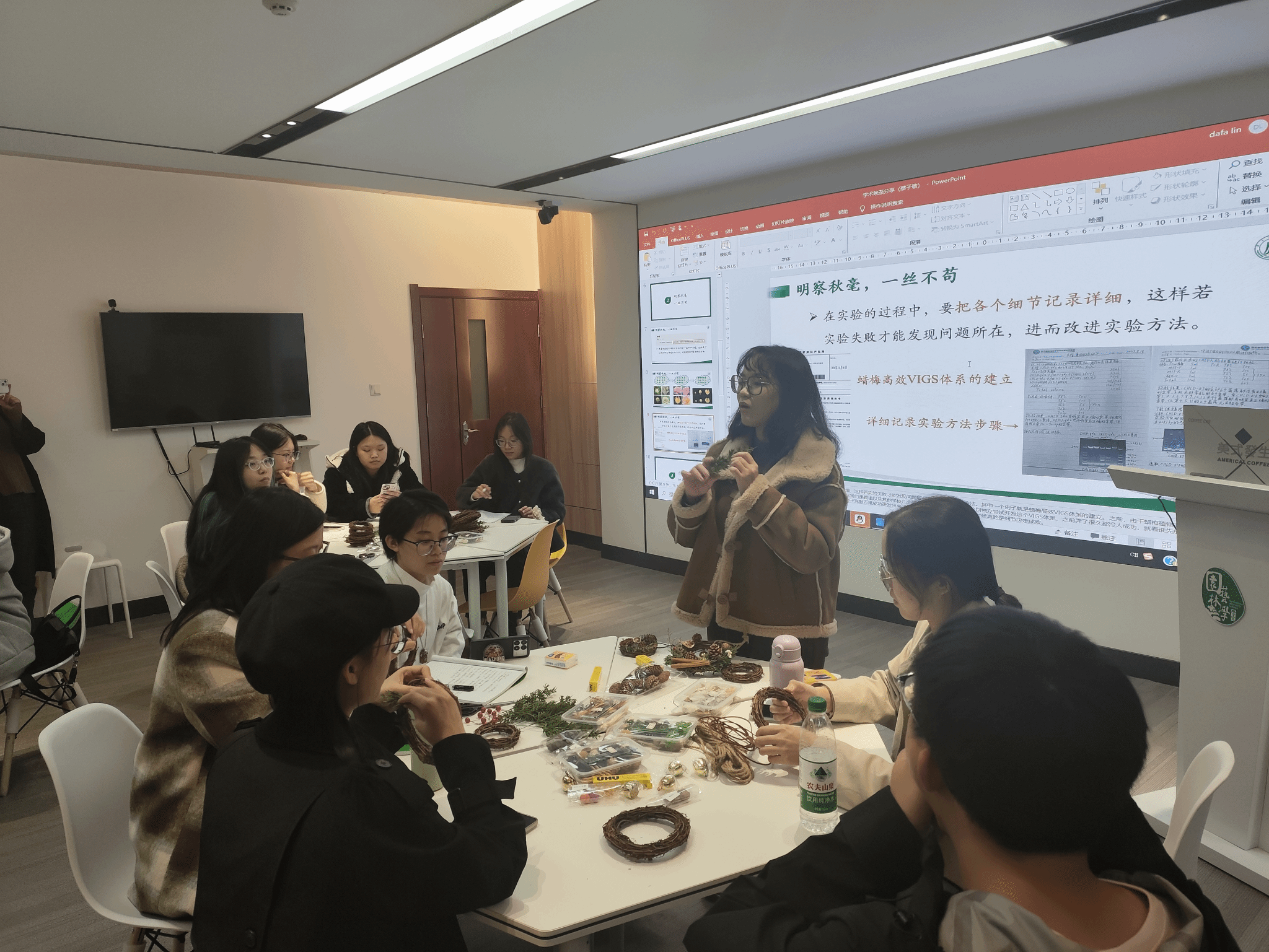 最后,活动负责人林志颖给大家介绍了桌子上为大家准备好的花材和花艺工具,指导同学们根据自己喜好与需要选择花卉材料,自行发挥想象力,创作出专属于自己的精美的秋日花环。