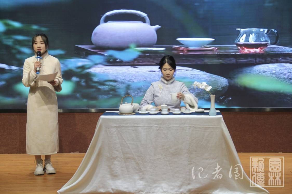 活动开始,茶学专业冯钰雯、曹雅婷同学带来盖碗茶艺表演,以端庄优雅的动作展示茶艺七道,带领观众一起静品茶茗。