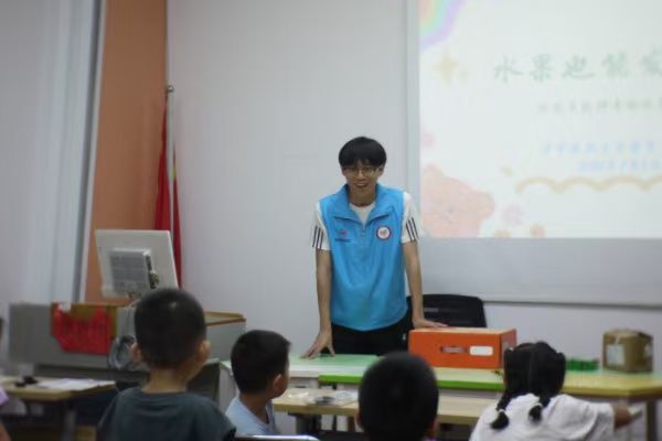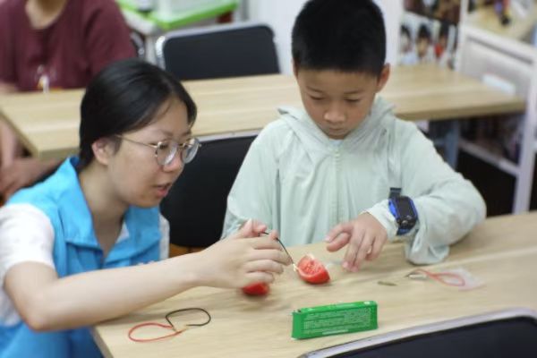 即使科学小课堂的开展并非一帆风顺——炎热的天气、活泼的小朋友、课堂秩序的维护等都为志愿者的工作提出了许多要求,但萌芽支教团的志愿者们依旧以高涨的热情引领小朋友们走进科学世界,帮助小朋友们答疑解惑,教他们如何正确区分正极、负极,铜片、锌片,如何安全正确地连接导线、将金属片插入番茄中。当小灯泡成功被点亮后,小朋友开心地对志愿者比了个大拇指,在这一过程中,支教团的志愿者们用笑容和鼓励,循循善诱,用水果发电的原理结合“动动小手”的实验环节,寓教于乐,为玫瑰湾社区的孩子们打开了科学启蒙的大门。“哥哥姐姐我明天再来找你们好不好?”一位齐刘海的小女孩问道。这次的小课堂不仅得到了孩子们的喜爱,还得到了家长的肯定。“不仅能把灯点亮,还能知道它为什么亮。”孩子父亲李先生说道。