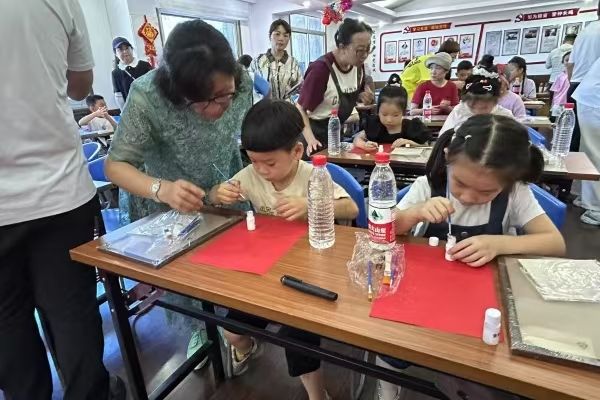 在手工环节,从用胶水勾勒轮廓到如何贴箔,徐键向孩子们细致讲解了非遗手工金箔画的制作流程。其他实践团成员们对孩子们进行具体指导,帮助他们了解各材料的用法并协助他们完成金箔画。园林2301班孔祥凝在活动过程中说道:“看着金箔纸在阳光下闪闪发亮,突然觉得,平凡的日子加点小惊喜,也能变得耀眼起来。”当看着孩子们举起写着“爱我中华”的金箔画合照时,实践团成员们胸中回荡着浓烈的幸福感和责任感。