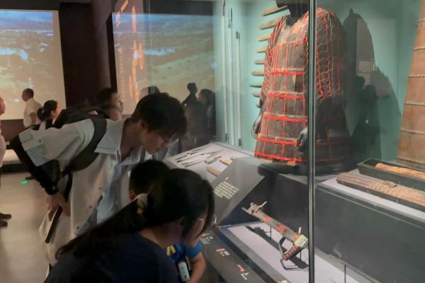 在北馆展厅,团队成员仔细观察展出的文物。澳门十大网投正规官网平台园艺2301杨天赫在一件楚式漆器前驻足,认真看它的色彩和纹饰,想从细节里探寻楚人的审美和生活;生命科学技术学院生工2304黄冰瑶则关注一组青铜兵器,看它们的造型和锈迹,感受古代工艺的精湛。这些文物仿佛在诉说过往,团队成员沉浸其中,为后续的讲解和调研积累认知与素材。