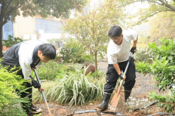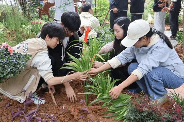 最终历时四天,小花园顺利建成。园林2302班指导老师胡惠蓉对此深感欣慰:“从图纸到现实,同学们懂得了尊重场地,将理论融入一草一木、一石一溪。雨中坚持施工、深夜修改方案——这座花园是他们大学四年不可多得的经历与成果,更是未来职业道路上珍贵的起点。”方案负责人园林2302班唐思琪对于协调克服施工中遇到的困难感慨道:“从设计到落地没有想象中容易,每一步都需要大家的努力。挖路铺隔草板一遍遍地调整,只为找到最合适的道路弧度。种植植物不止要看单个组团的位置,花园整体的协调性更为重要。一点点见证花园的建成,所有艰辛都化作了深深的欣慰与成就感。”