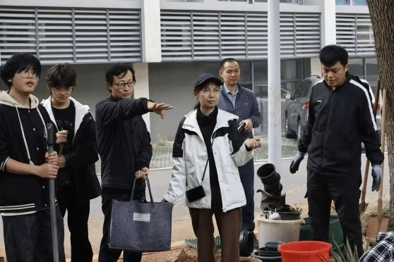 营建过程并非一帆风顺。在施工期间遭遇连续阴雨,又因土壤板结、地基不平使得挖掘和铺路工作举步维艰。面对挑战,同学们并没有退缩,而是在老师的指导下灵活协调:在铺路阶段,同学们一部分用锄头凿开坚硬的石头,一部分用铲子深挖泥地,即使雨水打湿脸颊、裤脚布满泥泞仍然砥砺坚持。四位老师也全程加入了同学们的行列中,生动诠释着“言传身教,知行合一”。在植物落地阶段,老师和同学们进行了更细致的分工:胡惠蓉老师带领着方案组同学对植物搭配与摆放深入琢磨;校园、花卉基地、现场植物组和采石组同学在张佳琪老师的带领下进行植物材料的采集与运输工作;种植组同学在张俊卫老师细致的指导下配合完成每一处植物的种植;尚均忠老师则融入同学们施工的行列中,不辞辛苦地挥铲锄地、示范种植……