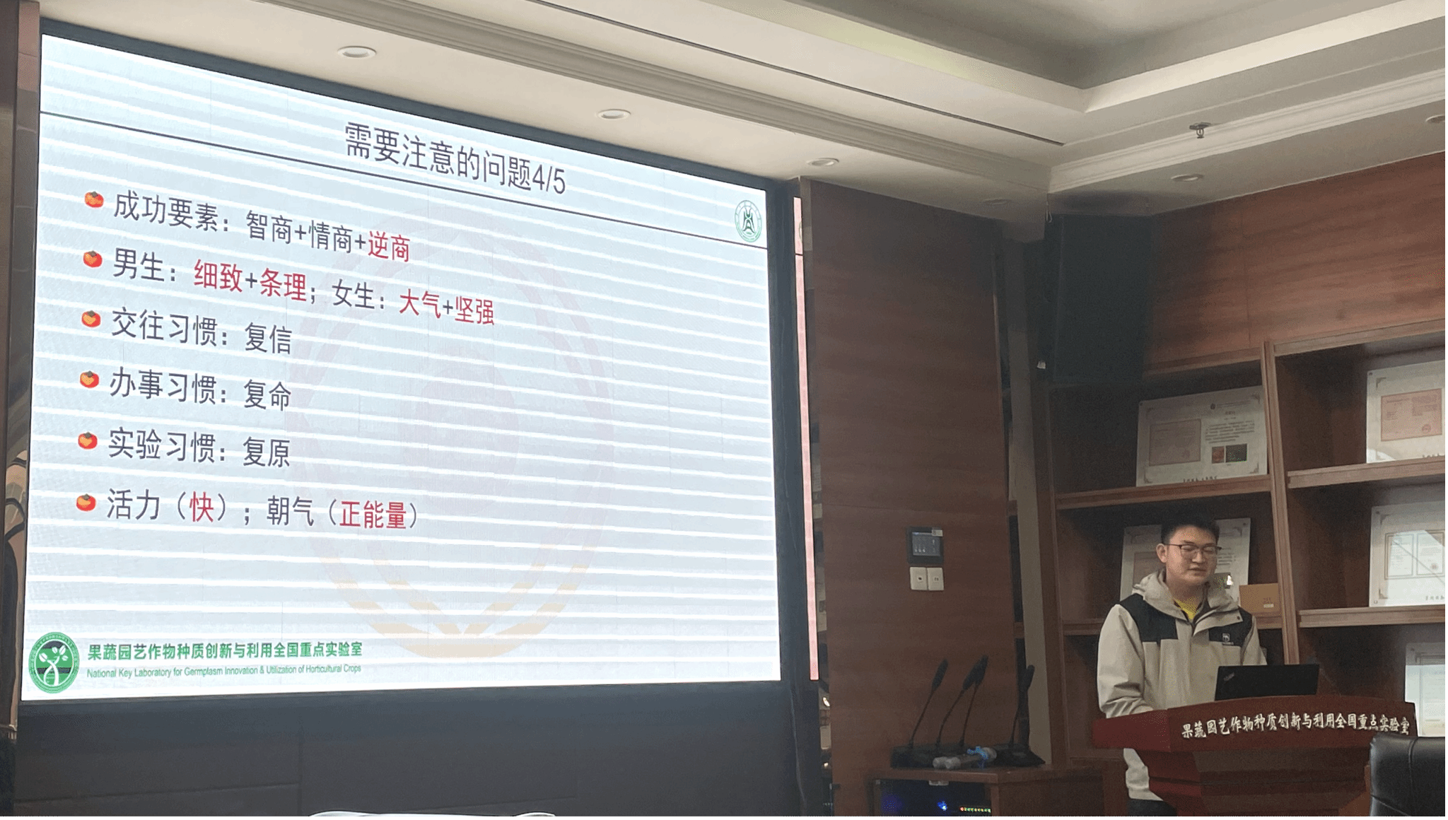 袁清韵,23级蔬菜学硕士,以“我与国奖那些事儿”为题,分享了她的科研历程与个人体悟。她以“萝卜叶片表型”为引,鼓励同学们在科研遇阻时不要急于自我否定;倡导在学业之余,从“身体、精神、创造”三个维度培养可持续的爱好;并结合自身经验,提出“先完成再完美”“主动生啃文献”以及“切换思维视角”等切实建议。她认为:“国奖不是论文大奖,是‘把闭环走完’奖——科研、生活、身体、灵魂,任何一块长板都能让你上岸。”