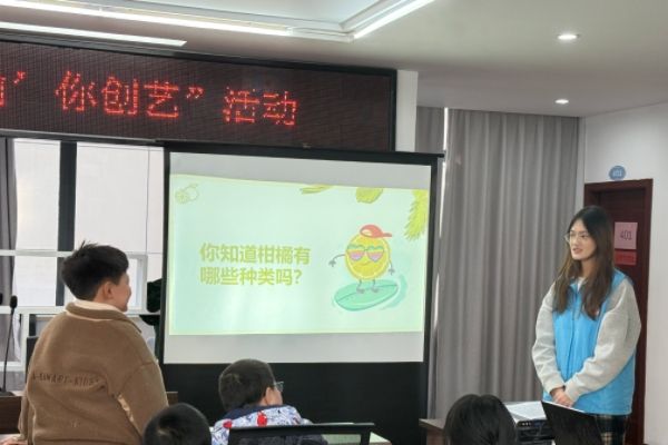 “大家知道柑橘有哪些种类吗?”园艺2402班的苏琳茸以提问的方式开启了这场柑橘探秘之旅,大家纷纷抢答:“我知道,橘子!”“我知道柠檬也属于柑橘!”在孩子们的踊跃互动中,苏琳茸详细介绍了柑橘家族的多样成员,从常见的橙子、橘子到独特的佛手柑、西柚等,通过生动的讲解和直观的图片展示,让孩子们对柑橘的种类有了更直观的认识。随后,苏琳茸向孩子们介绍了柑橘的生命历程——从发芽抽梢到开花结果的全过程。“柑橘的生长是一场跨越四季的旅程。”在这场对柑橘生命历程的探秘之旅中,孩子们了解到,柑橘的生长需要适宜的温度、充足的阳光和适量的水分,柑橘的储存技巧和挑选方法,让孩子们在日常生活中也能有技巧地选择和保存柑橘。