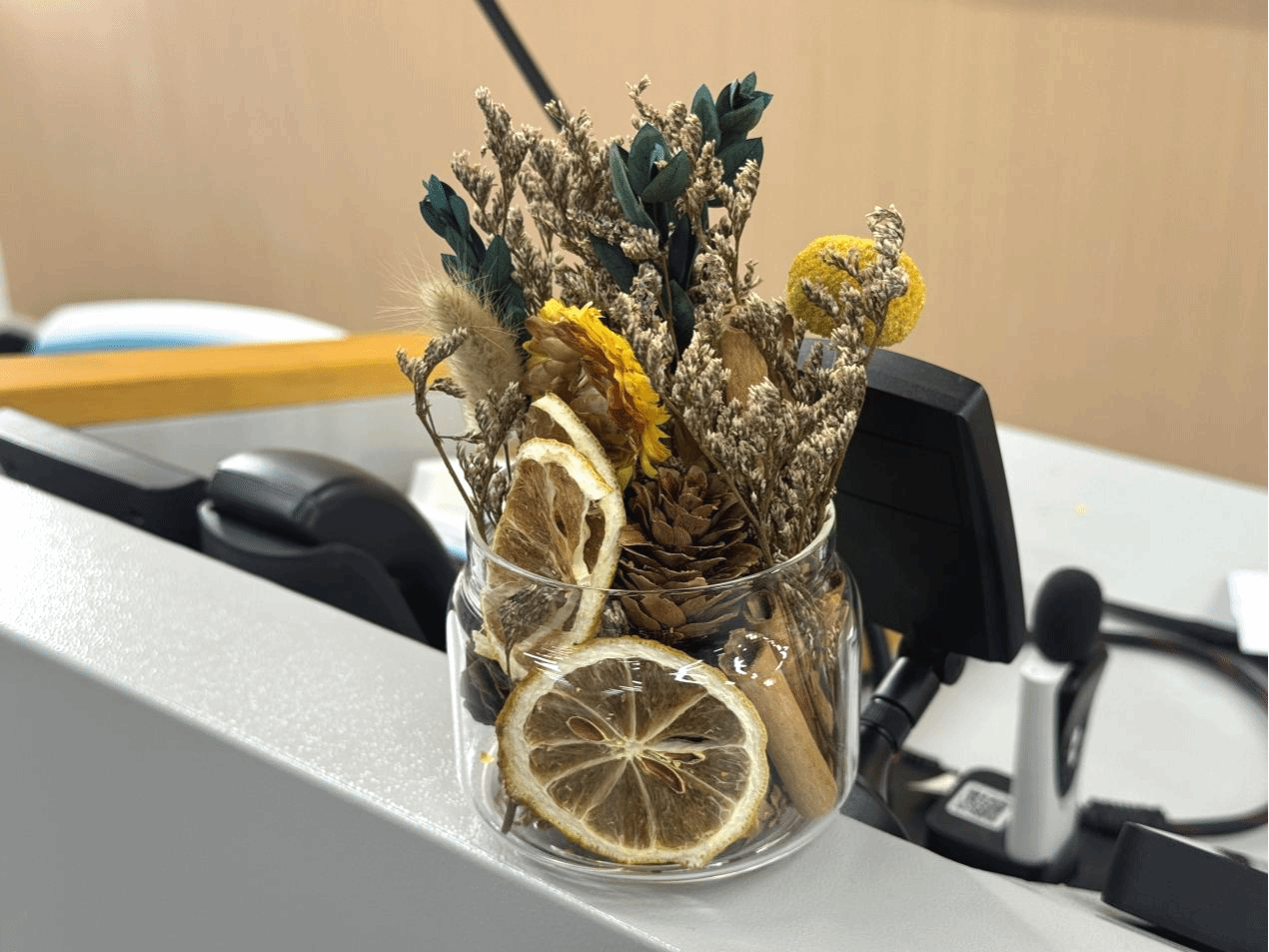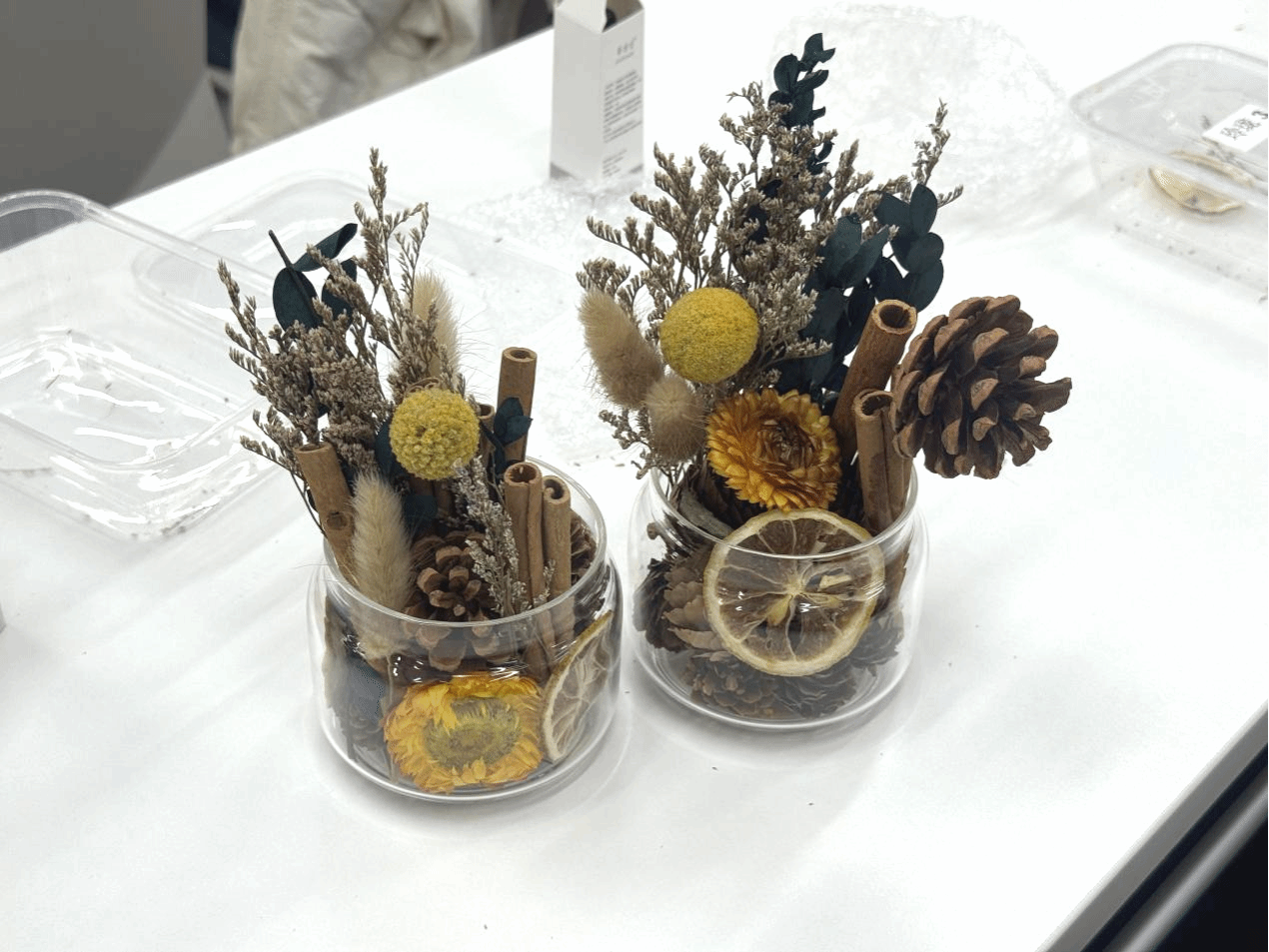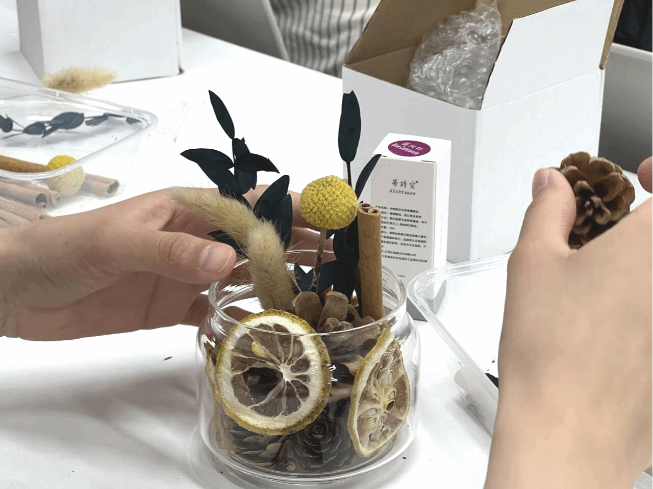 主办方为参与者准备了包含精油、植物花材和玻璃瓶在内的香薰材料包。在悠扬的背景音乐中,同学们将此次制作视为一次微缩的“造园”实践——依据个人喜好挑选香味与植物素材,将干花与枝叶置入瓶中,注入香氛,封存属于自己的“理想之境” 。现场,一个个精致的香薰瓶逐渐成型,仿佛一座座微缩的秘密花园,承载着创作者对自然与记忆的独特理解。