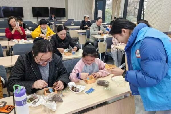 紧接着,最受期待的多肉手工制作环节正式开启。桌上整齐摆放的营养土、圆润石粒、形态各异的多肉幼苗及小巧装饰,瞬间吸引了所有人的目光。居民们满怀期待地围坐桌前,在志愿者的贴心协助下,迫不及待动手创作。老年居民们戴着老花镜,小心翼翼地用小铲子铺土,神情格外认真。志愿者们穿梭其间耐心指导,细致解答居民疑问。欢声笑语中,一个个创意十足的多肉微景观陆续诞生。居民们手捧作品,脸上洋溢着满足的笑容,在动手实践中体悟到植物的美好,也加深了对多肉养护知识的记忆。