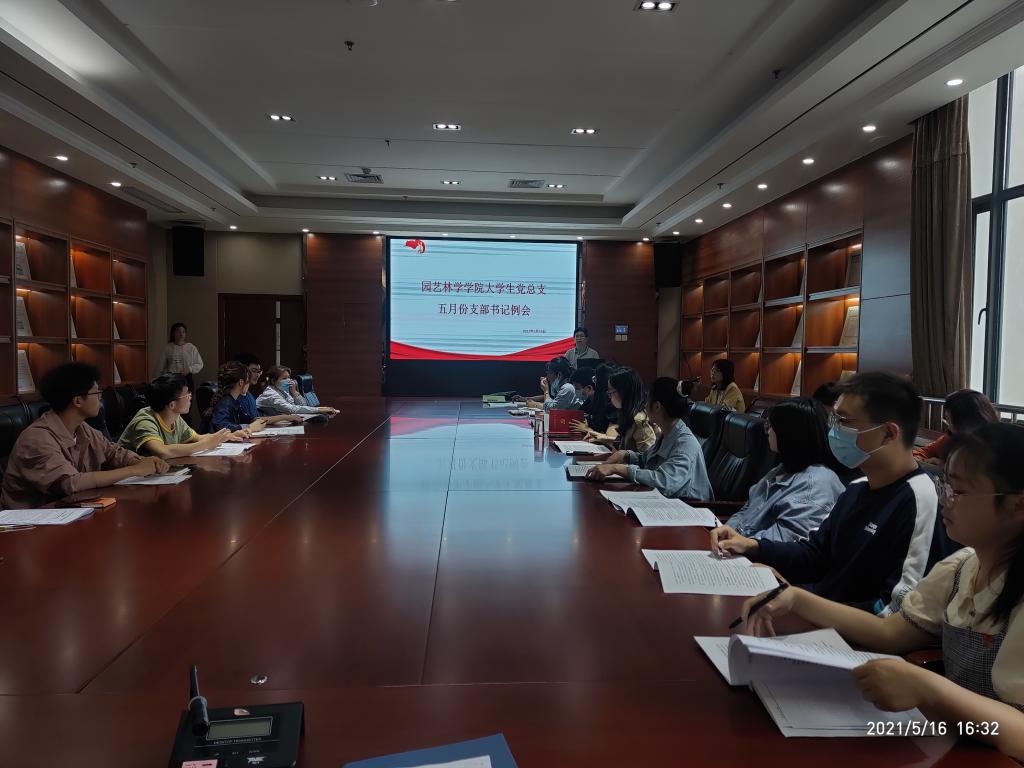 2021年5月16日下午4点,澳门十大网投正规官网平台召开大学生党总支五月份支部书记例会,会议由大学生党总支书记蔡江主持,各学生支部书记先后汇报本学期支部党史学习教育的工作经验与特色做法。