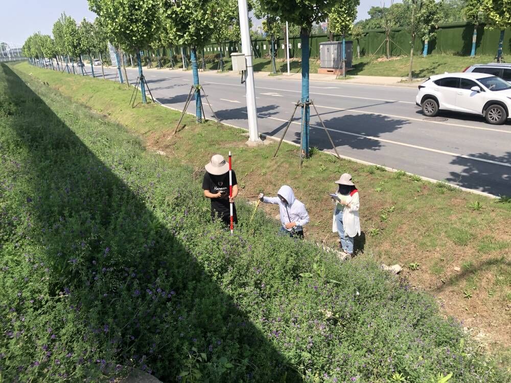 次日,团队来到了高速公路边坡示范点,调查高速公路的边坡植被的恢复效果。成员们首先对边坡的长度,方位等进行了测量,接着对边坡的植被以及工程措施进行调查。与成员们前期所去的堤岸边坡有所不同,在高速公路外沿,更多的植被呈现出自然生长的效果,没有人工管理的痕迹。因而,在对高速公路、仓区等有污染气体的地方进行植物配置时,要考虑一些可以吸收有毒有害气体的植物。