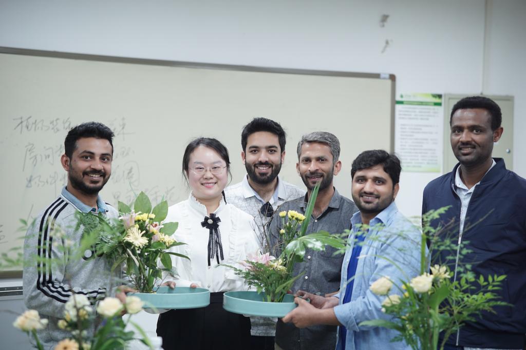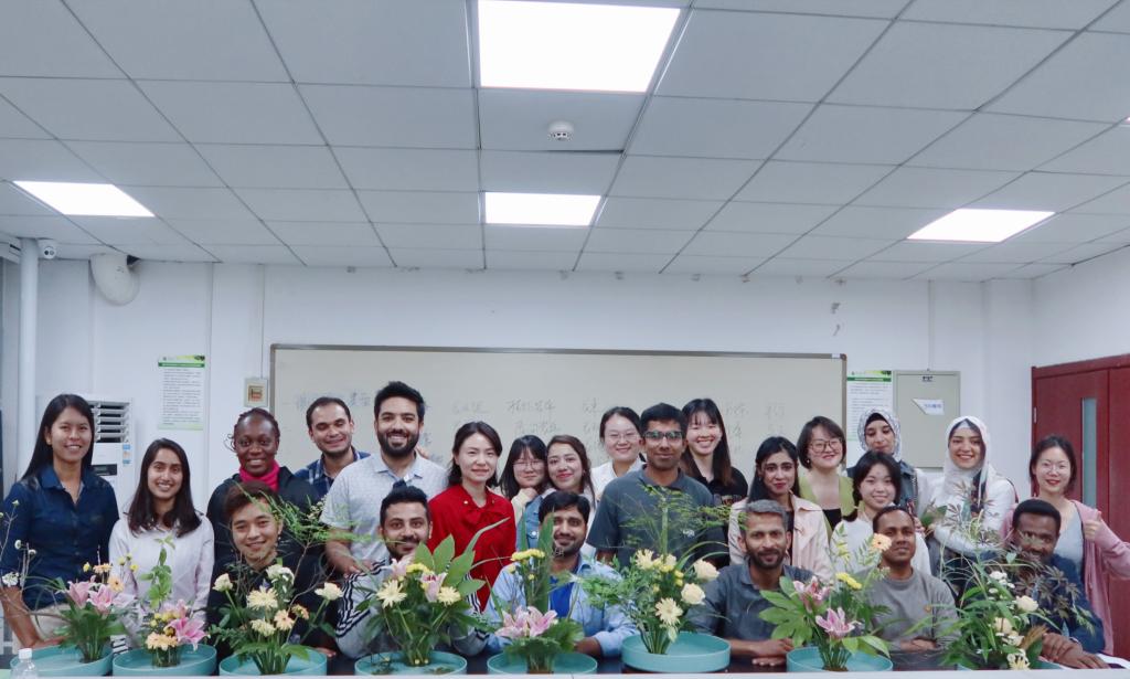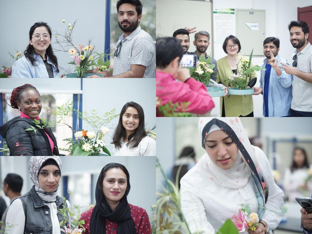 以花悟道,修身养性。留学生们格外珍视此次插花活动,女生们精心打扮,男生们特意着装,大家精心设计每一个插花步骤,认真完成属于自己的插花作品,直到活动结束前一秒才满意地将自己的作品呈现在展示台上。来自巴基斯坦的任一凡同学表示:“自己非常喜爱花,这次的花艺体验让他感受到了中国传统花艺的博大精深,也提升了对美的鉴赏能力”。来自越南的阮范雄同学谈到:“结合以前我的了解和今天的活动,我感受到了‘真、善、美’在中华传统文化和中华精神文明中的力量”。来自缅甸的涂叶密同学开心说道:“谢谢王老师肯定我的作品,我从东方传统插花中发现了生活的乐趣”。来自埃及的李灵同学讲到:“我将花材放置在水中构型的灵感来自于自己的国花——睡莲,我希望置于水中的花朵,能够模拟睡莲漂浮在水上的圣洁美好,增加自己花艺作品的层次性和丰富性”。最后留学生们争相拿着作品合影留念,留下这次东方传统插花之旅的美好回忆。