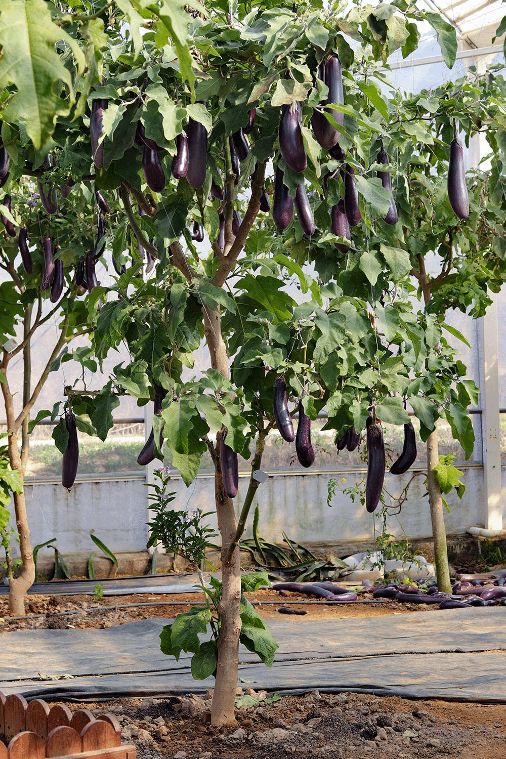 三四十根紫色长茄,错落有致地垂挂在一棵3米多高的树上,像极了古代仪仗伞盖上的流苏。