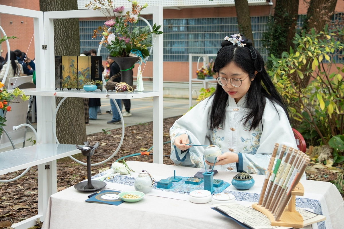 松灰、压灰、扫灰、放篆、打篆、起篆、燃篆,循着一股香气,园林植物专业硕士研究生张若馨正在用独特的香料和打香技巧为大家展示香篆礼仪,一招一式让在场师生连连称赞。