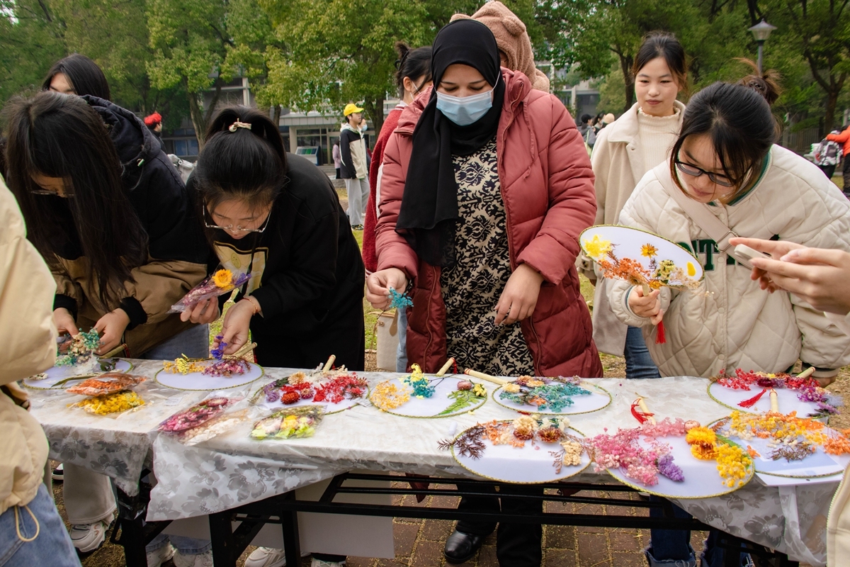 橘子灯、压花书签、植物拓印、扭扭棒花卉、锦花团扇、创艺花环、茶点心等制作体验区围满了人,大家在活动组织同学的指导下,发挥着自己的才能,创作出属于自己的作品。热气腾腾的烤红薯、香味扑鼻的关东煮、鲜红喜人的糖葫芦、奶香四溢的围炉奶茶则给大家在寒冷中带来一丝温暖。