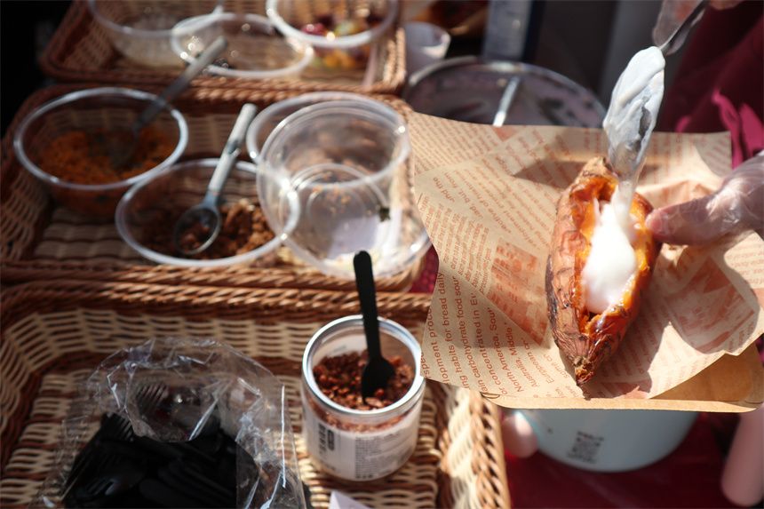在美食区,精心呈现了一系列由科技成果转化而来的特色佳肴,让观众在“观赏”与“互动”之外,深入感受“舌尖上的园艺”。掰开刚出烤箱的红薯、升腾的热气驱散了初冬的寒意,“蜜薯暖冬”摊位前排起了长长的队伍。这款名为“红安苕”的红薯通过华中农大蔡兴奎老师团队组培脱毒技术成功培育,推动了红安苕产业的突破。除了这些创新成果,澳门十大网投正规官网平台花卉基地“听香园”内栽培的香草所制成的香草鸡蛋饼,以及采用自主研发水果制作的水果捞和蔬菜沙拉等,亦纷纷亮相展区。