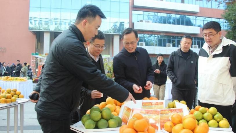 学校党委常委、副校长杨少波在柑橘展台观看品种(夏琳琳 摄)