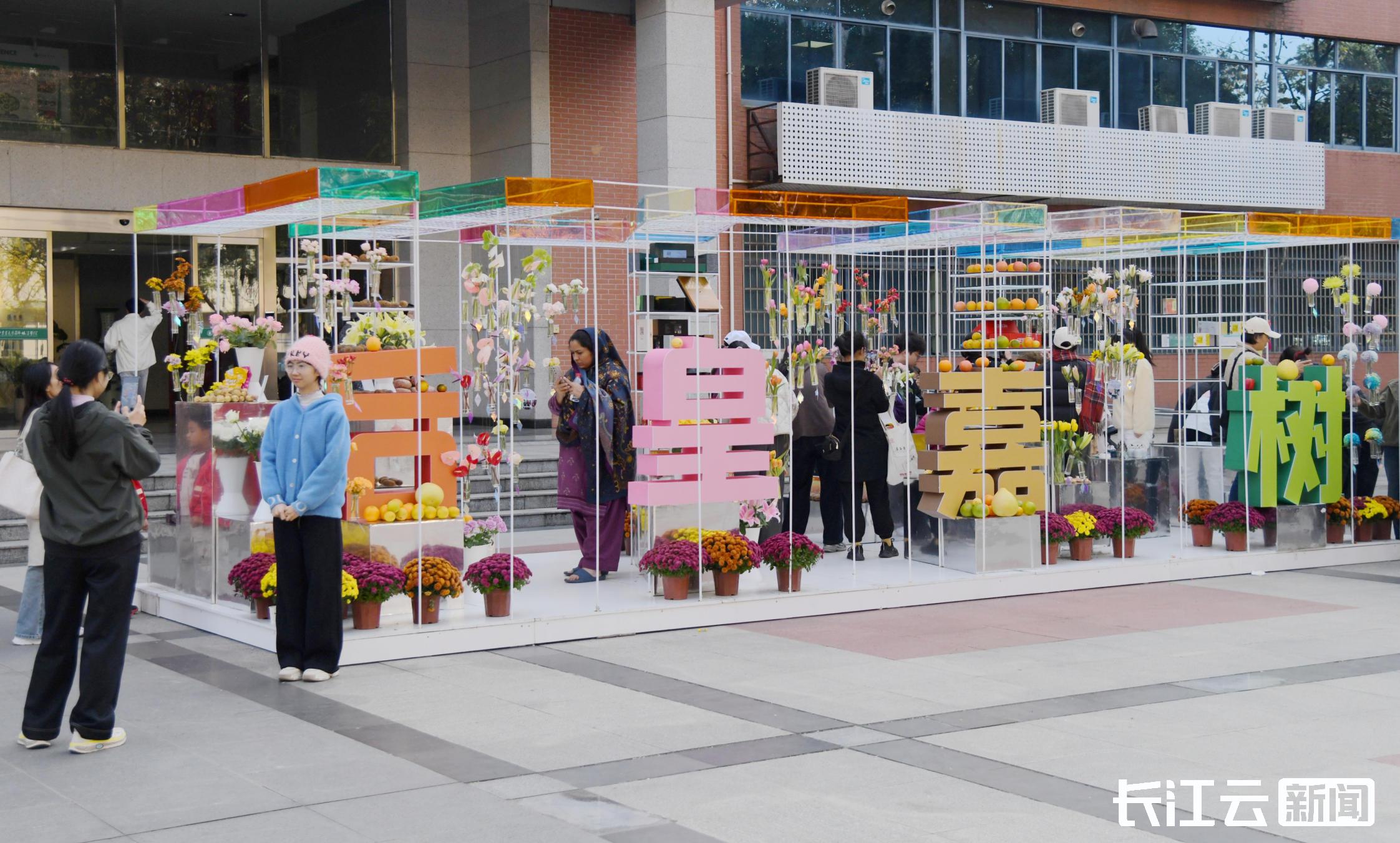 现场,艺术装置为园艺节增添了美学色彩。园林北楼前,“生命格栅”艺术造型将柑橘、马铃薯等作物与学校自育花卉巧妙搭配,形成充满科技意蕴的微缩景观。狮子山广场上,以《楚辞》为灵感的花艺装置《后皇嘉树》,以散尾葵、向日葵等植物复刻“后皇嘉树,橘徕服兮”的意境,成为观众拍照打卡的热点。