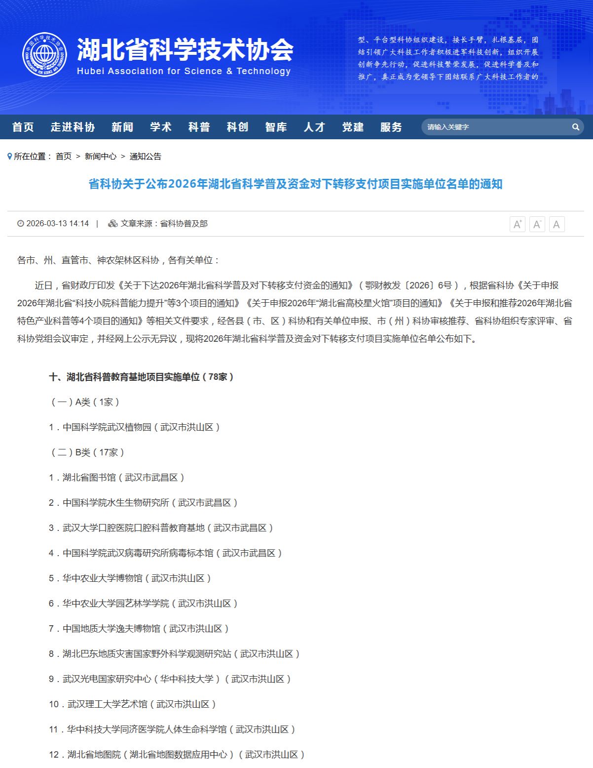 近日,湖北省科协公布了2026年湖北省科学普及资金对下转移支付项目实施单位名单。经过严格的申报推荐、专家评审及公示程序,十大网投正规官网科普教育基地凭借扎实的建设基础和显著的科普成效,成功获批“2026年湖北省科普教育基地提能项目”。