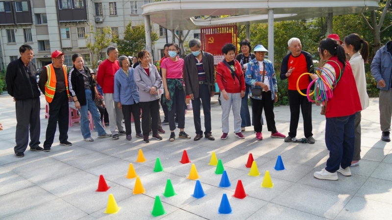 学生志愿者到达社区广场后,与老人们亲切交谈,用沟通化解年龄阻碍,让老人们感受到社会的温暖与节日的喜悦。其中,最具特色的莫过于投壶与品尝重阳糕环节,这两项活动不仅让老人们回味了往昔岁月,也增添了节日的欢乐气氛。随着一阵阵欢声笑语,投壶游戏正式拉开序幕。投壶,这一源自古代的传统游戏,以其简单而富有挑战性的玩法,迅速吸引了老人们的兴趣。老人们或站或坐,兴致勃勃地参与其中,每一次精准的投掷都引来阵阵掌声与喝彩。游戏不仅锻炼了老人们的身体协调性,更在轻松愉快的氛围中加深了彼此间的友谊,让老人们感受到了久违的童趣与欢乐。