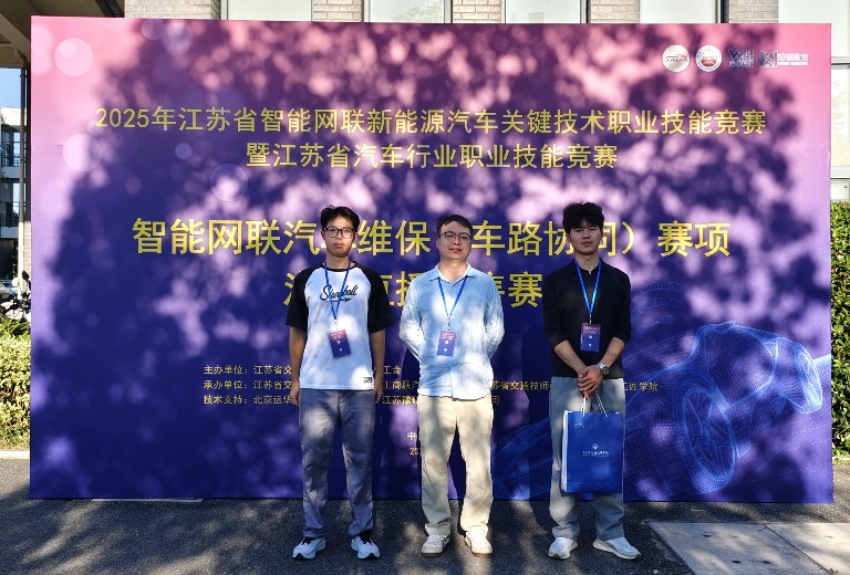 2025年8月22日至24日,由江苏省交通运输厅、江苏省总工会主办的2025年江苏省汽车行业职业技能竞赛“智能网联汽车维保(车路协同)”赛项在江苏省交通技师学院举行。来自全省24支职工代表队和17支学生代表队同台竞技。经过三天激烈角逐,我校世界杯体育官方网站朴禹滈老师获得教师组三等奖,谢学飞、施水娟老师指导的甄子寒、朱子寒同学分别获得学生组二等奖、三等奖。